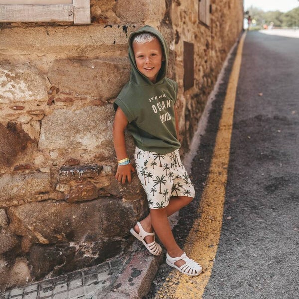 De Crown Tree Short is een korte broek die perfect over de zwemkleding kan. Na het zwemmen willen de kinderen natuurlijk ergens wat eten, hoe beter kan dat met dezelfde handgetekende outfit!